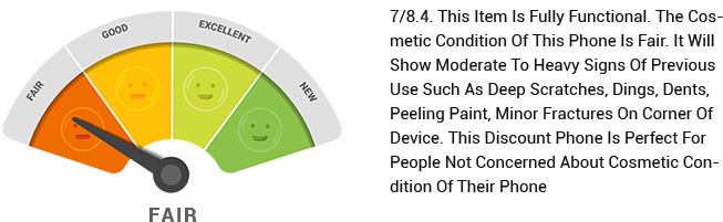 [C] Fair: 7/10 This Item is fully functional. The cosmetic condition of this phone is fair. It will show moderate to heavy signs of previous use such as deep scratches, dings, dents, peeling paint, minor fractures on corner of device. This discount phone is perfect for people not concerned about cosmetic condition of their phone